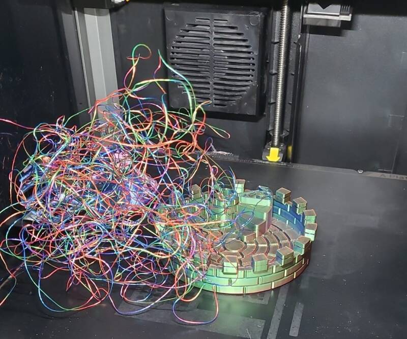 Tras hacer las 5 primeras, tenemos problemas con las 2 siguientes, similar al del caso anterior. ¿Por qué? si los valores son los mismos y no han cambiado? Agus, por experiencia ve que en la parte de las almenas de abajo, el hilo está imprimiéndose mucho más delgado que la altura de capa configurada y obviamente las capas no se están uniendo correctamente y esto puede ser debido a una cosa. El material no se está extruyendo correctamente.
